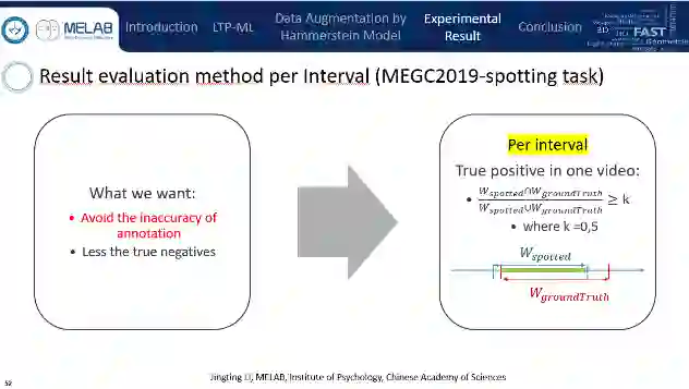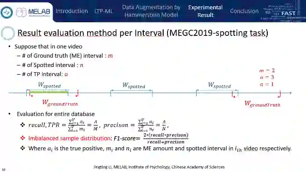 为了避免微表情标注不准确带来的影响和逐帧检测导致大量真负值的出现,李博士提出了基于区间的微表情评估方法。通过比较检测区间和真实微表情区间的重叠率来判定检测结果是否正确。同时,为了避免样本分布均衡导致的问题,最终的检测性能由F1分数来衡量。这个评估方法被用于第二、三届微表情挑战大赛(MEGC2019, 2020)的检测任务结果衡量。