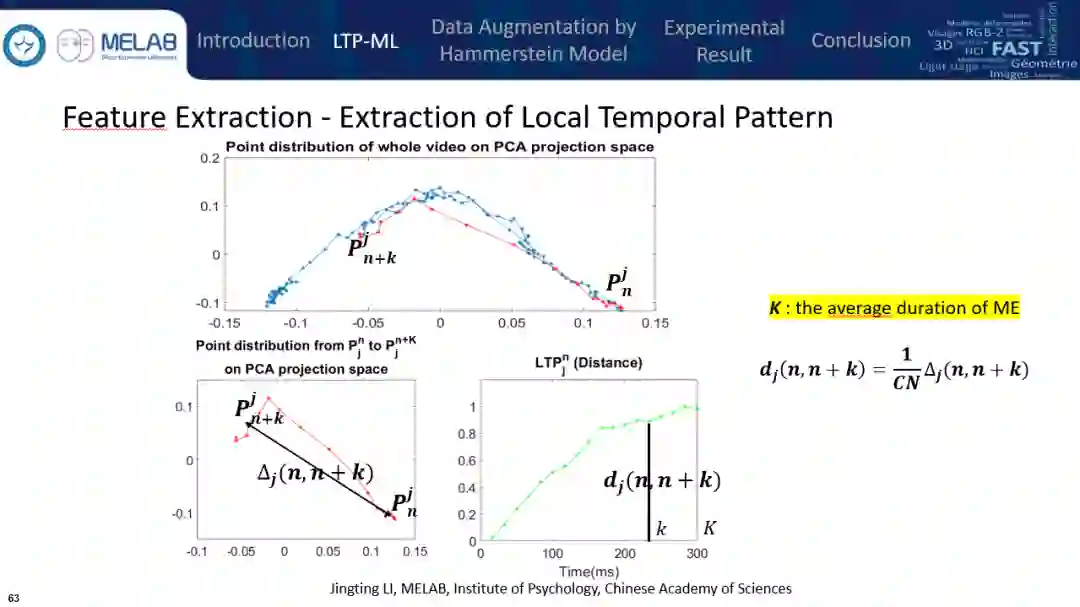在得到局部兴趣区间的微表情视频片段后,李博士提出利用主成分分析(PCA)来提取视频在时域上的主要变化,通过基于微表情平均时长的滑动窗口,计算窗口首帧与其余帧的距离,最终得到局部时域模式(LTP)。