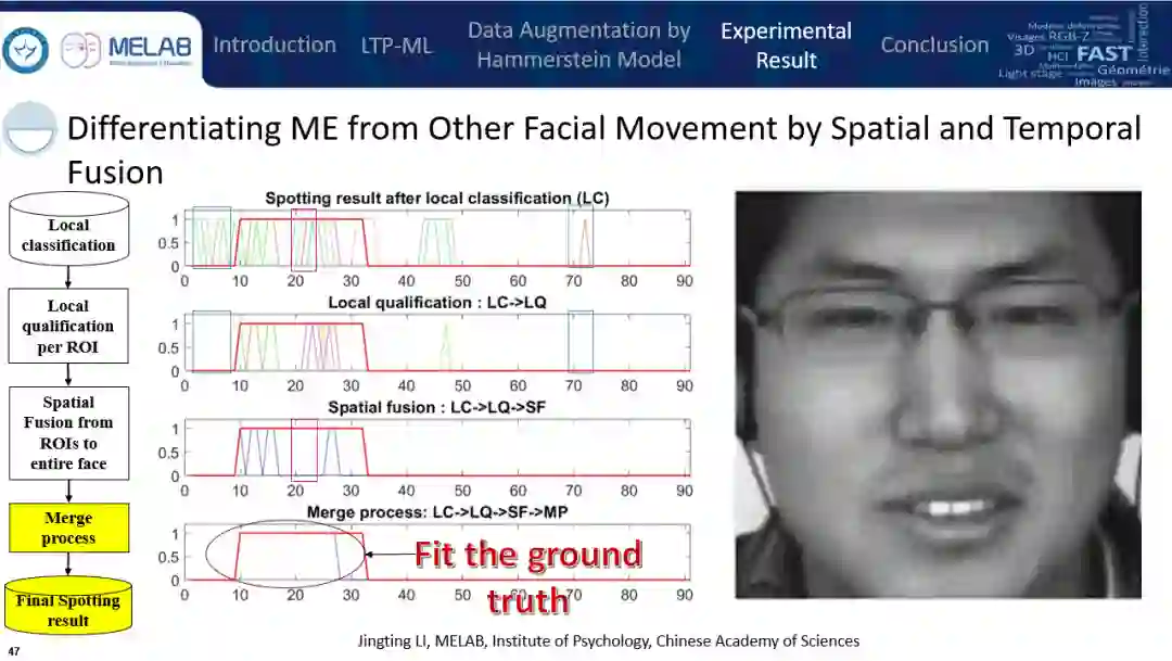 在得到局部的检测结果后,李博士提出了局部量化、从局部到全脸的时空融合和连续帧融合三个步骤,从而获得最终的微表情片段检测结果。该晚期融合增强了检测方法区分微表情和其他面部动作的能力。