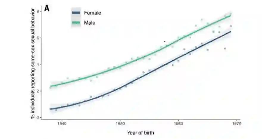 尽管这项研究没有对环境的影响做详细讨论,但论文中的一张插图或许能帮助我们理解社会环境对同性性行为的影响。研究人员发现1960年代出生的人中报告同性性行为的比例远高于1940年代以前出生的人,这一现象在英国诺丁汉大学媒介与文化研究副教授包宏伟看来,与近几十年西方社会对同性恋的包容度提高有关。
