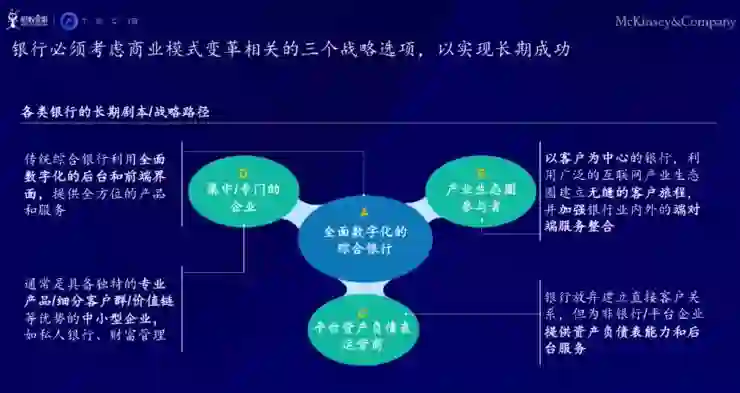 比如全面的数字化,会让银行面临很多的技术挑战和整合的挑战。在这过程当中,我们也需要去了解在生态圈里面其他参与者的业务发展进度,了解那些以客户为中心的银行如何为他们的客户使用体验提供额外的价值,并且跟上服务跟整合的进度。也可以顺应工业化进程的潮流从而降低银行业的现有成本,这会是银行未来增加利润跟投资回报率的一个重要举措。