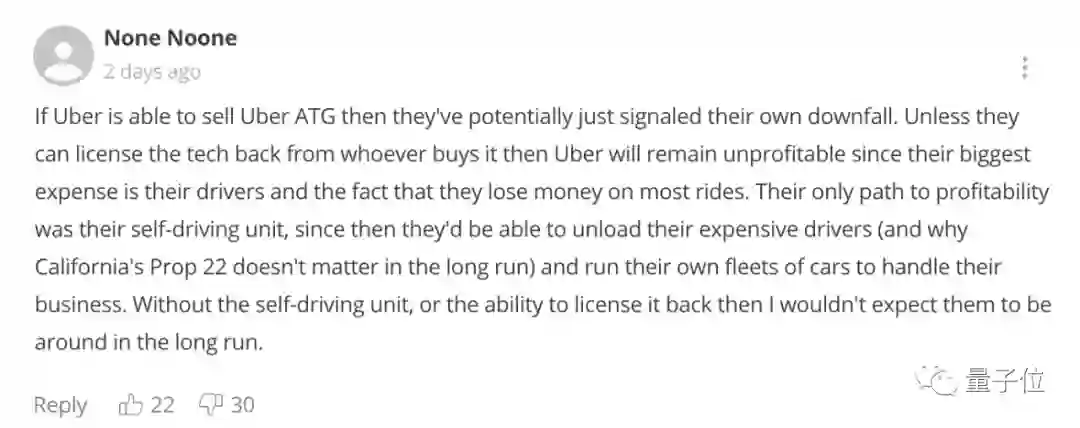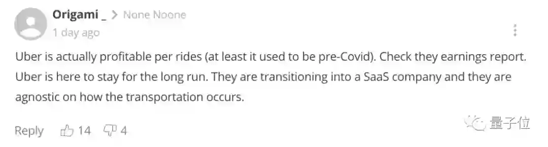 也有网友表示,看财报的话,Uber每趟车其实是盈利的,至少在新冠之前是这样的。但Uber转型成为SaaS公司,他们不知道自动驾驶将如何发展。