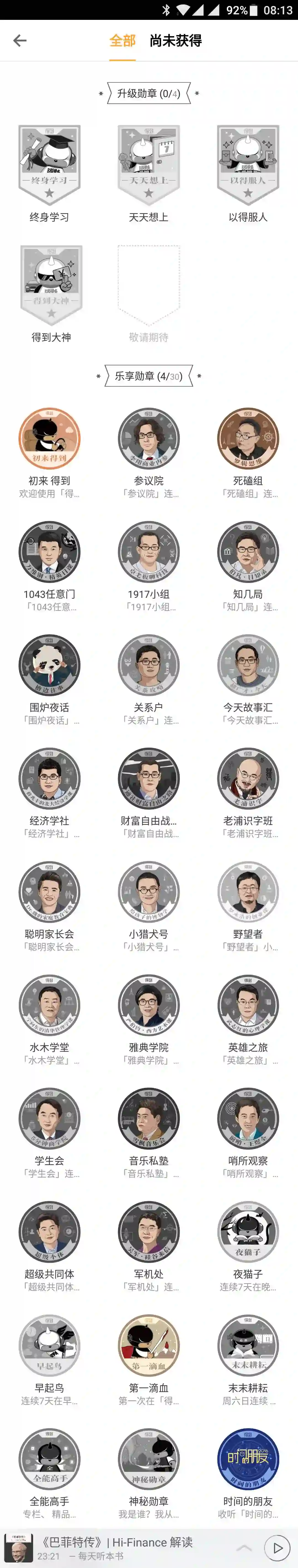 得到APP通过勋章功能设计,用户在完成既定任务后即点亮指定勋章。勋章的点亮情况以及获得情况会在勋章页面进行展现。通过上图勋章展现页面以及具体的勋章获取介绍可以发现,勋章的设计主要有两个目的:用户活跃留存、用户付费转化。