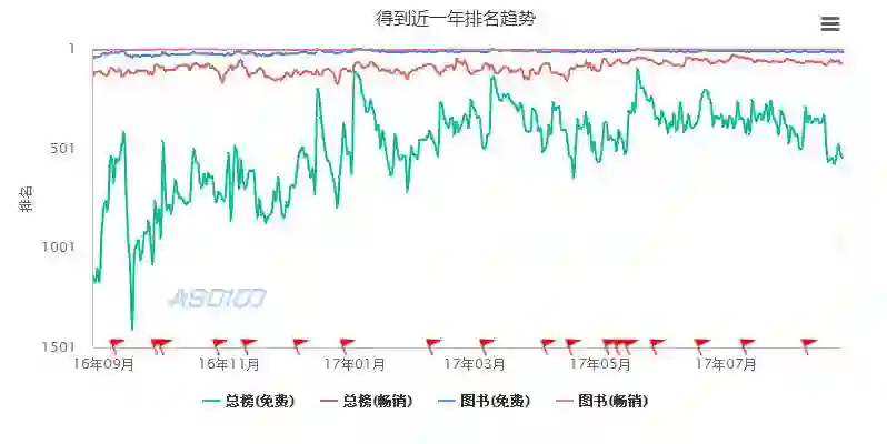 上图为得到APP近一年AppStore的排名情况,在图书类畅销、免费以及总榜畅销类APP中一直处于比较前列的位置。这也说明知识付费类APP在近一年的时间得到了很多用户的关注和使用。