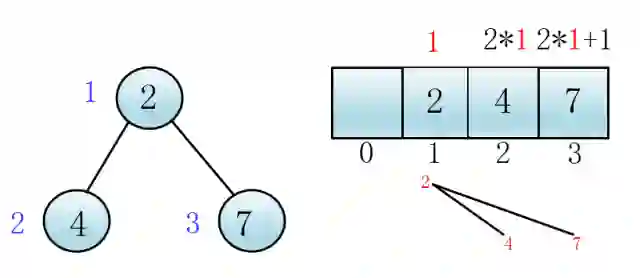 这样,父子关系就可以用下标来表示了,显然,在k下标处的节点的左孩子一定在2*k小标处,右孩子在2*k+1处
