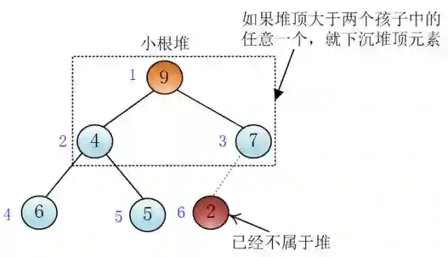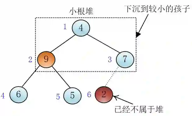与插入相对应,我可以将堆顶这个元素向下沉