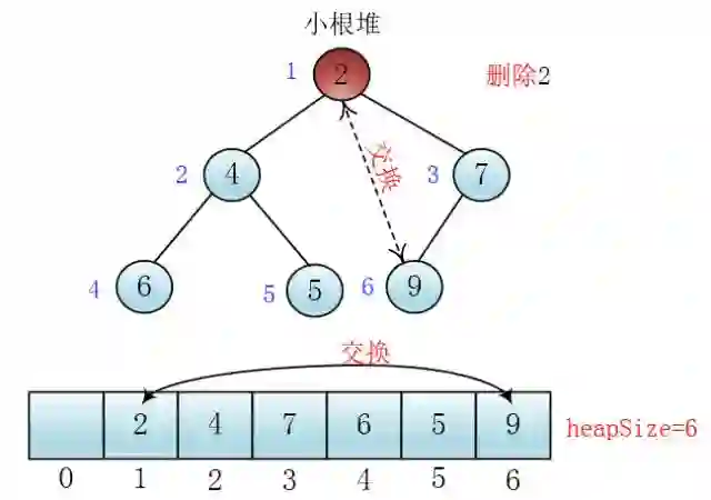 这样我就通过交换堆顶元素与最后一个元素和heapSize减一把堆顶元素删除了
