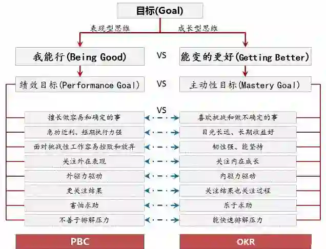 2. OKR更强调员工自主发挥能动性,把目标定得更具挑战性,同时不作为员工绩效考核的直接输入,它定出的目标实际上就是主动性目标(Mastery Goal),即Getting Better型目标。