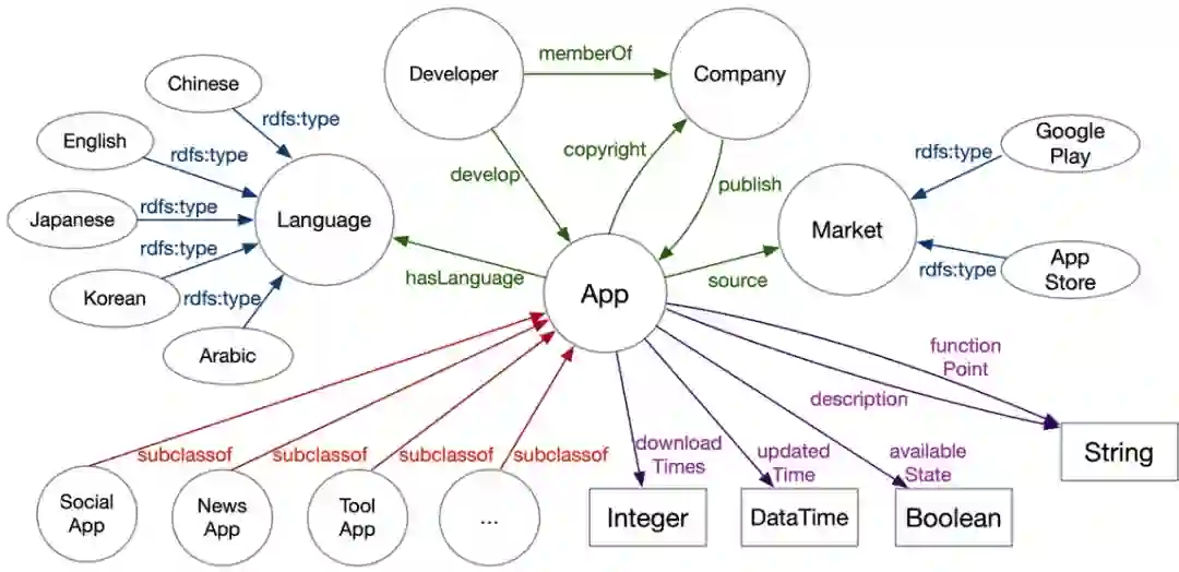知识对齐:我们注意到大多数应用通常会发布在不同的移动应用商店,但对它们描述标签的具体取值可能是异构的。此外,不同的移动应用商店对APP关系和属性的描述方式也存在差异。因此,找出来自不同应用商店的APP以及相应实体之间的对应关系(又称匹配)至关重要,这样有助于APP信息的共享与重用。为了实现这一目标,我们尝试采用以下方法进行知识对齐。