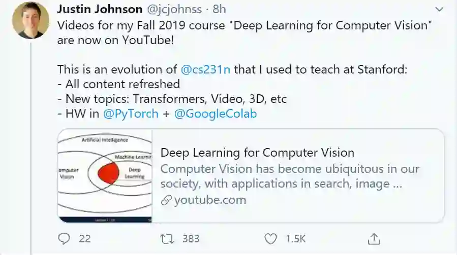 讲 CS231n 的 Justin Johnson 在密歇根大学推出了一套计算机视觉的进阶课程。