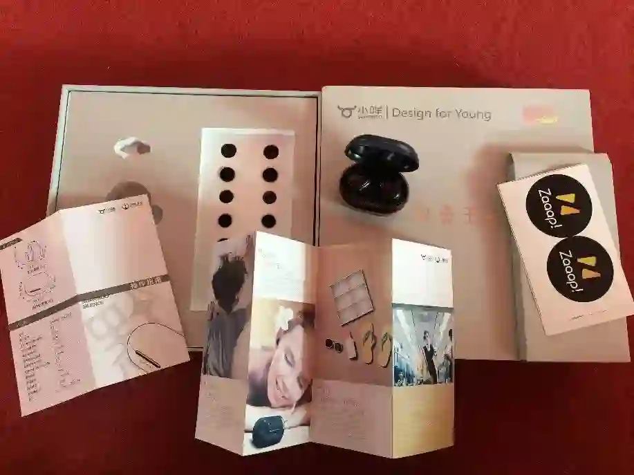 打开包装盒,耳机主体本身、充电盒、C 口充电线、两幅胶性备用塞、两幅慢回弹的记忆塞、一份产品说明和一张操作详情。