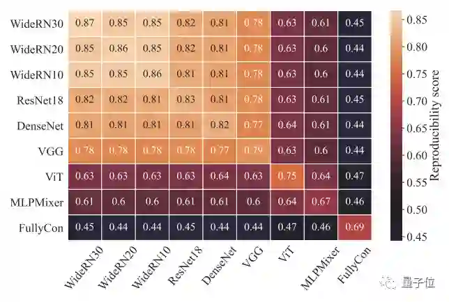 作者设计了一种更直观的度量方法来衡量各架构的可复现性得分,结果确实验证了我们的直观感受: