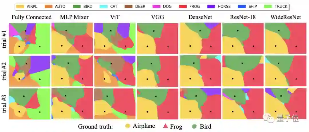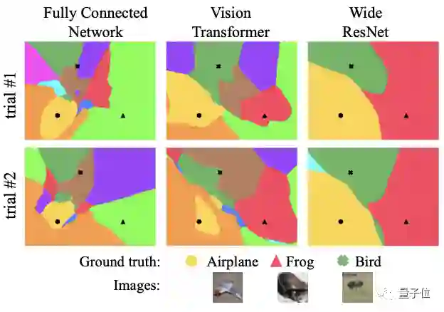 在这项研究中,作者从CIFAR-10训练集中选择了三幅随机图像,然后使用三次不同的随机初始化配置在7种不同架构上训练,绘制出各自的决策区域。