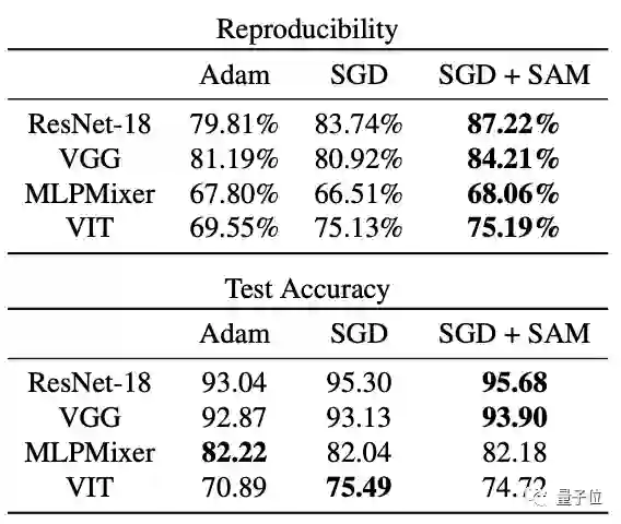 在下表中,我们可以看到SAM比标准优化器(如SGD和Adam)产生了更多可重复的决策边界。