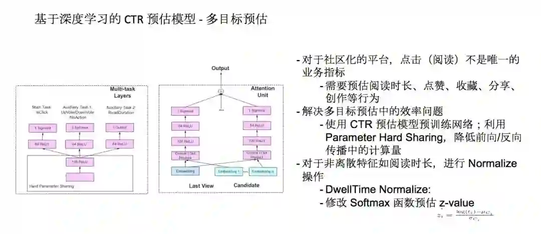 知乎是一个社区化的平台,常常需要平衡很多指标的收益,预估阅读时长、点赞、收藏、分享、创作等行为。为了解决多目标预估中训练和预测效率问题,我们使用了CTR预估模型预训练网络,利用Parameter Hard Sharing,点击和点赞这两层共享之前的权重,会有一个独立的隐藏层model task自己的目标,这样能降低前向/反向传播中的计算量。