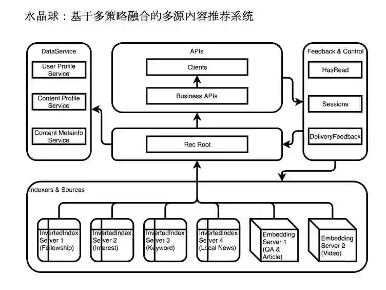 知乎的信息流推荐框架是一个基于多策略融合的多源内容推荐系统,代号“水晶球”。如图所示,在这个系统中,首页上出现的内容经历过两次排序。第一次是从数十个推荐队列里被“召回”,第二次是在合并后经过深层神经网络(DNN)的“排序”。