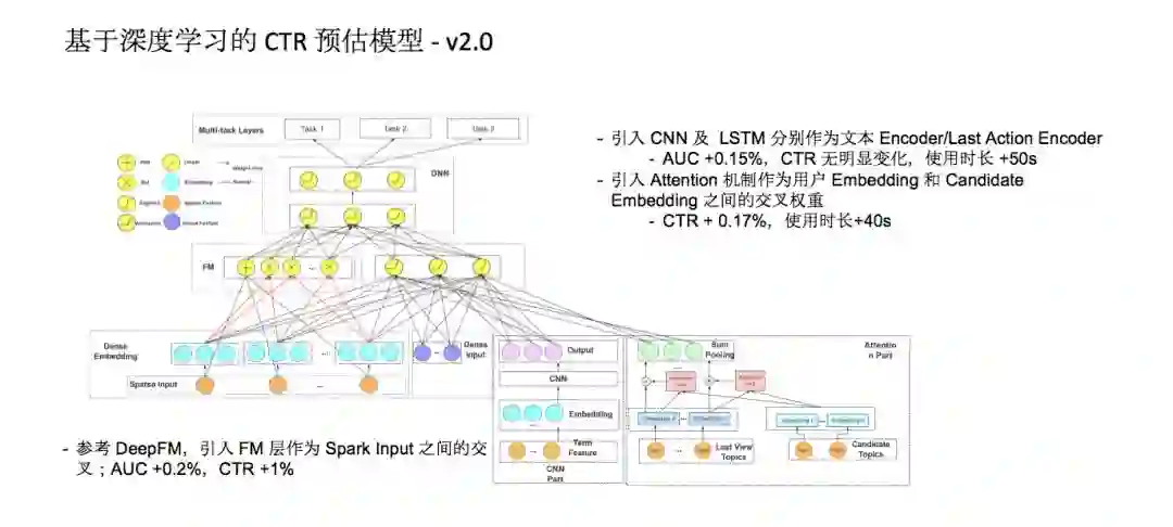 今年我们开始在深度学习的CTR预估模型上尝试更加激进更有意思的优化,也就是2.0版本。其中最早引入的优化还是特征之间的交叉,我们引入FM层作为这些类别之间的Sparse Input之间的交叉,AUC提升了0.2%,CTR提升了1%。引入CNN及LSTM分别作为文本Encoder/Last Action Encoder,单用户使用时长提高50秒。