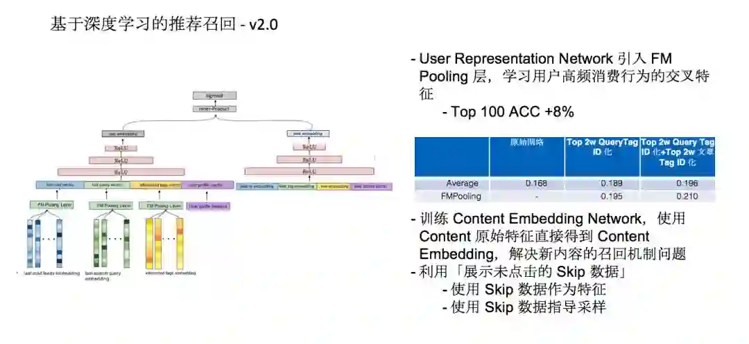 在用户表示网络这一侧我们也做了优化,这个网络里就是一个最简单的全链接神经网络,我们做优化的时候是在User Representation Network引入FM Pooling层,学习用户高频消费行为的交叉特征,会让Top100的精确度提高8%。