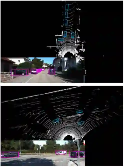 MV3D [37] 也同时使用 RGB 图像和激光雷达点云数据作为输入,它是将 3D 点云投影成鸟瞰图和正视图。鸟瞰图表征是通过高度、强度和密度编码的,而正视图则是将点云投影到一个圆柱面上生成的。鸟瞰图可用于生成 3D 先验边界框,然后将该 3D 先验边界框投影到前视图和图像上,这三个输入生成一个特征图。该方法采用 ROI 池化来将三个特征图整合到同一个维度。整合后的数据再在网络上进行融合,然后输出分类结果和边界框。