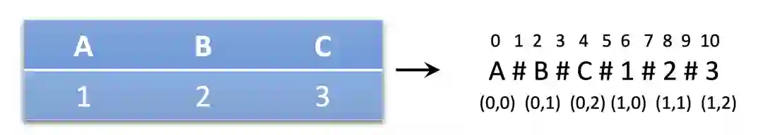 首先,结构化的表格构成输入数据时被拍平成一个序列,序列中token的序号 又进一步用两维的行序号 和列序号 表示。下图是这一个编号过程的概念示意图(注意:图中没有完全精确地表示分隔词和填充如何构造这样的细节信息,只做编号的概念示意)。