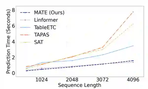 预测速度方面,在作者实验的云上64GB的虚拟机上,当序列长度增长到2048时,MATE比TaPas[7]快了近2倍。