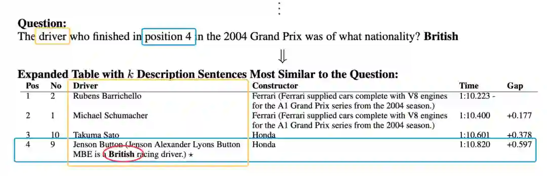 作者指出之前一些研究工作,在完成进行表格问答任务(table QA)任务时,使用的数据集token数目都被限制在512之内。而最近开源的一些数据集[3][4] 需要parse更长的半结构化文本。同样,我们先来看一个来自HybridQA[5]数据集的真实例子(图5)。HybridQA数据集中的表格抓取自维基百科。当某些单元格中的文本内容包含实体时,实体(entity)在维基百科中可能会有自己的超链接页面。数据集在构造时,对这些含有超链接的实体进行了展开处理。统计数字显示HybridQA数据集中,每个问题的表格平均有70个单元格和44个实体的链接,反应了这一数据集中文本的复杂程度。
