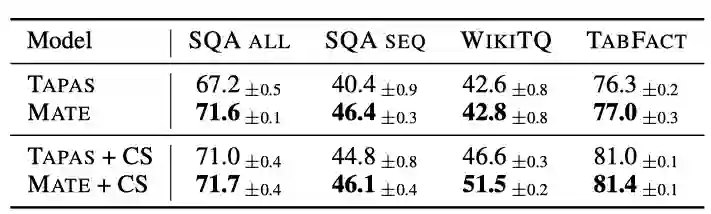 在实验评估中,作者主要关注两个方向:表格型数据的学习效果以及模型速度,与state-of-art方法相比,MATE都取得了显著的改善。学习效果方面,MATE将HybridQA数据集上的表格问答任务的最佳结果提高了19个点。