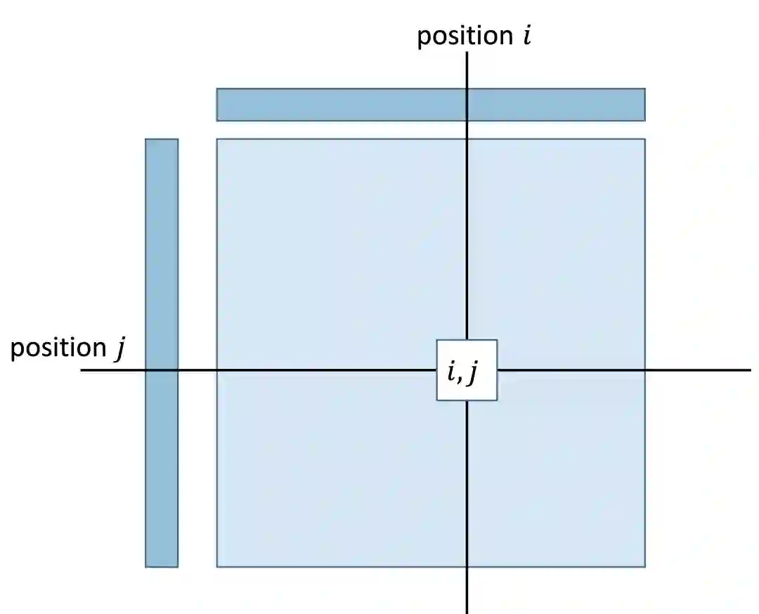 图2是注意力机制工作过程的一个概念示意图:两个序列中分别处于位置 和位置 的token计算一个相似度得分,这个得分表示了位置 处的token对齐(attends to)到位置 处token的强度。很容易看到,注意力机制的计算和序列长度呈平方复杂度关系,当序列长度增长到千以上这样的量级时,将会消耗大量的内存和计算时间。