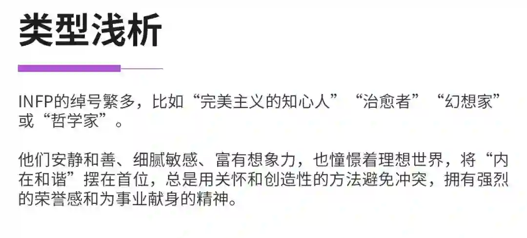 INFP是调停者型人格,往往是安静、思想开放和富有想象力的,做每一件事都采用关怀和创造性的方法。尽管他们可能看起来安静或谦逊,但调停者(INFP)拥有充满活力、充满激情的内心生活。