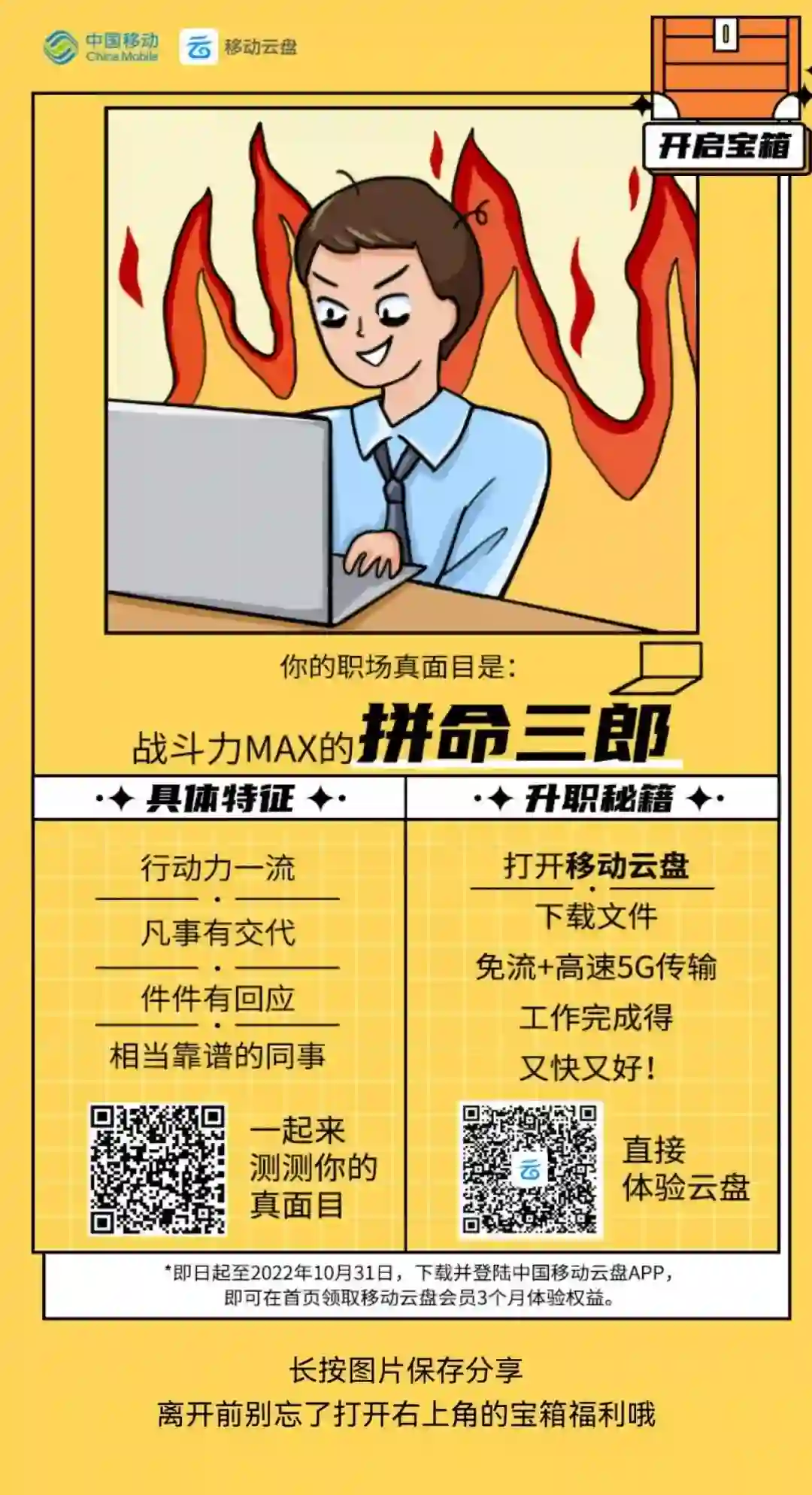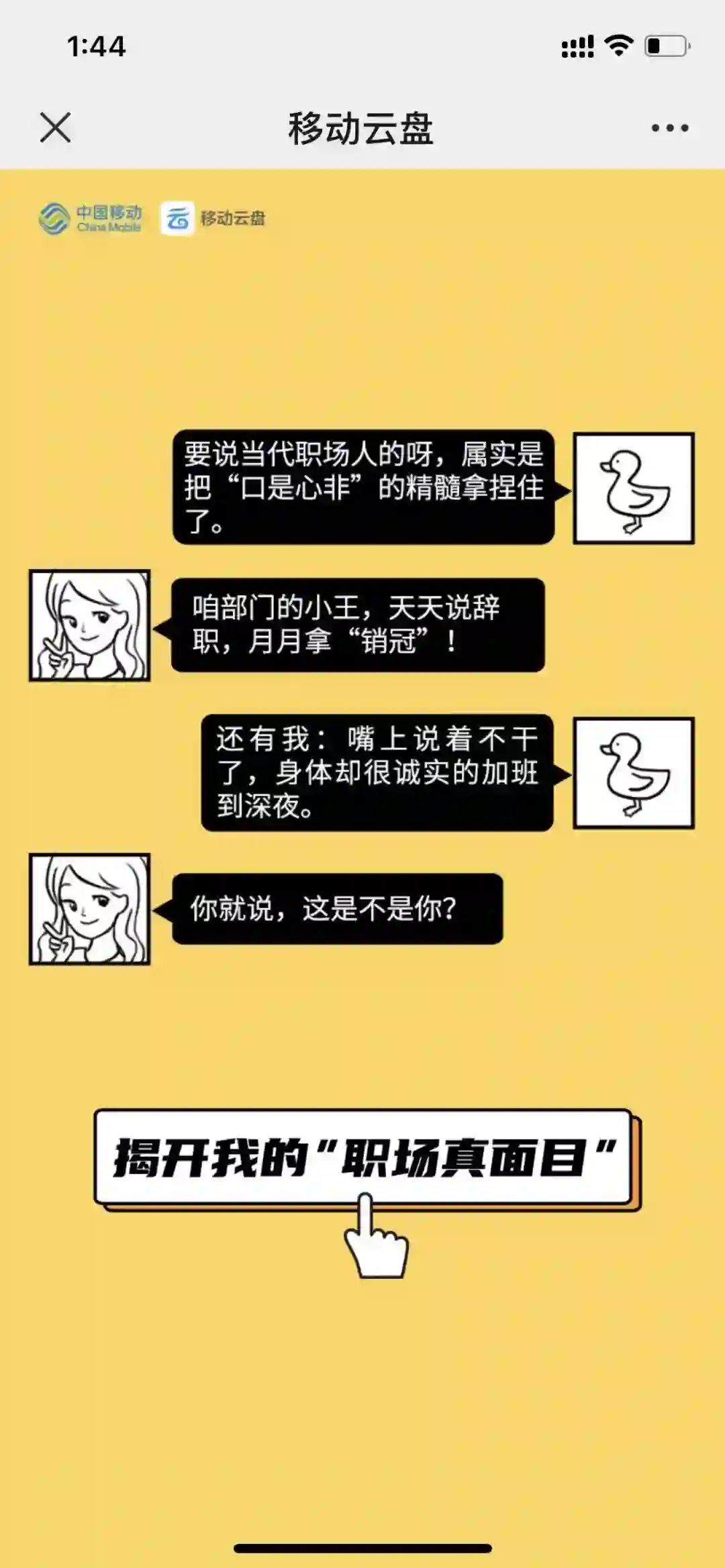最近,中国移动云盘上线了一个趣味职场测试,通过一系列趣味问答,测试用户的职场属性,问题设置轻松有趣,比如周末怎么安排、在吃饭时收到领导的信息回不回复、对象发信息抱怨手机内存不够怎么办。