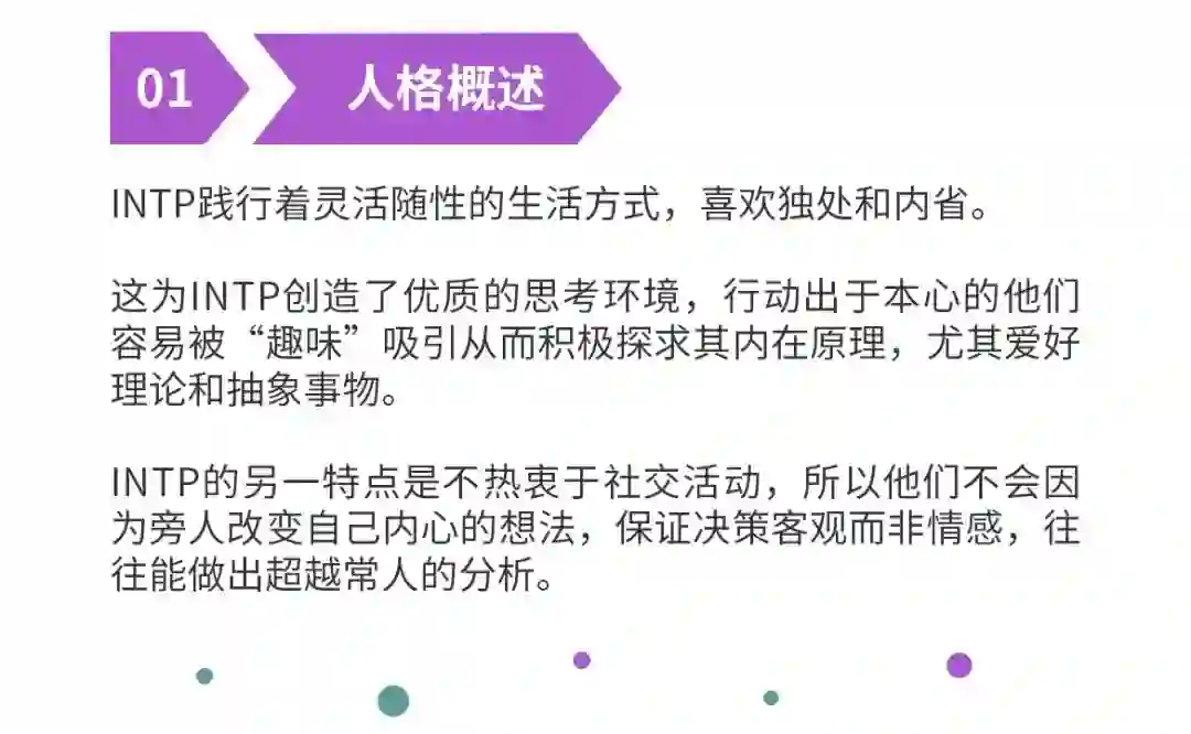 INTP型人格擅长独立思考,他们大多逻辑思维清晰,是追求极致的完美主义;不过有时,他们工作中也会因沉浸在自己的思路中而影响工作进度。