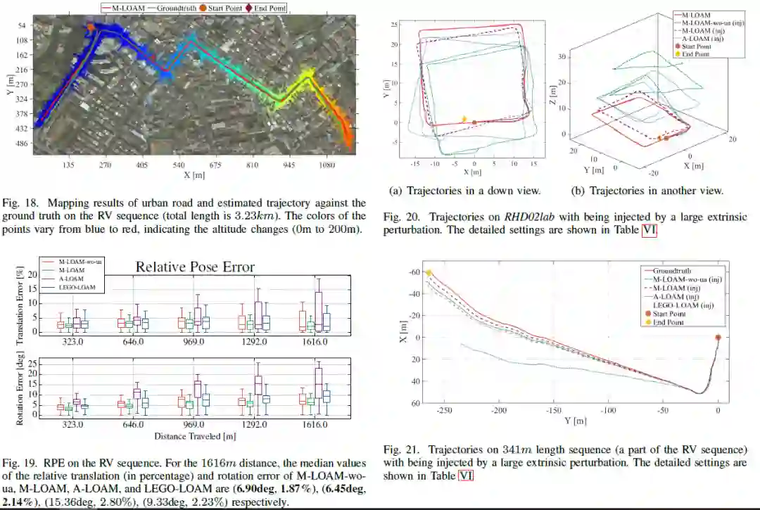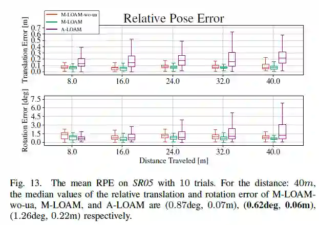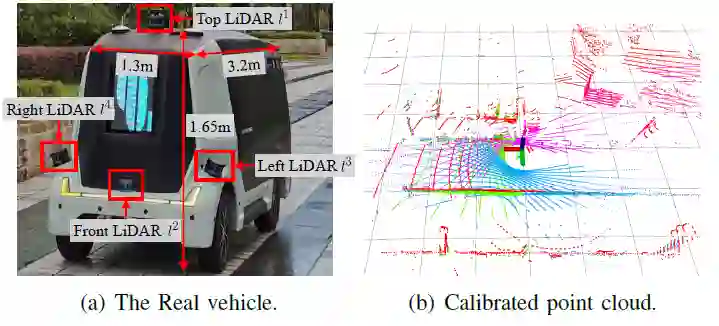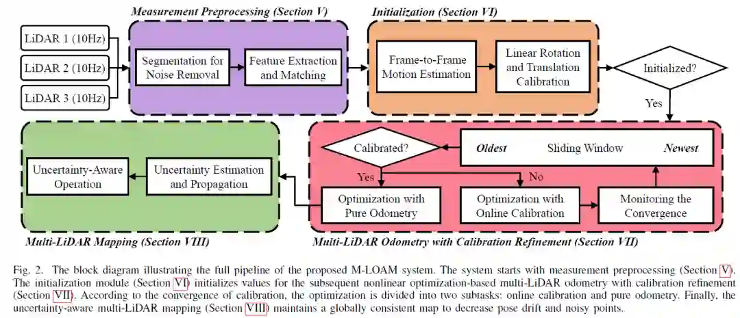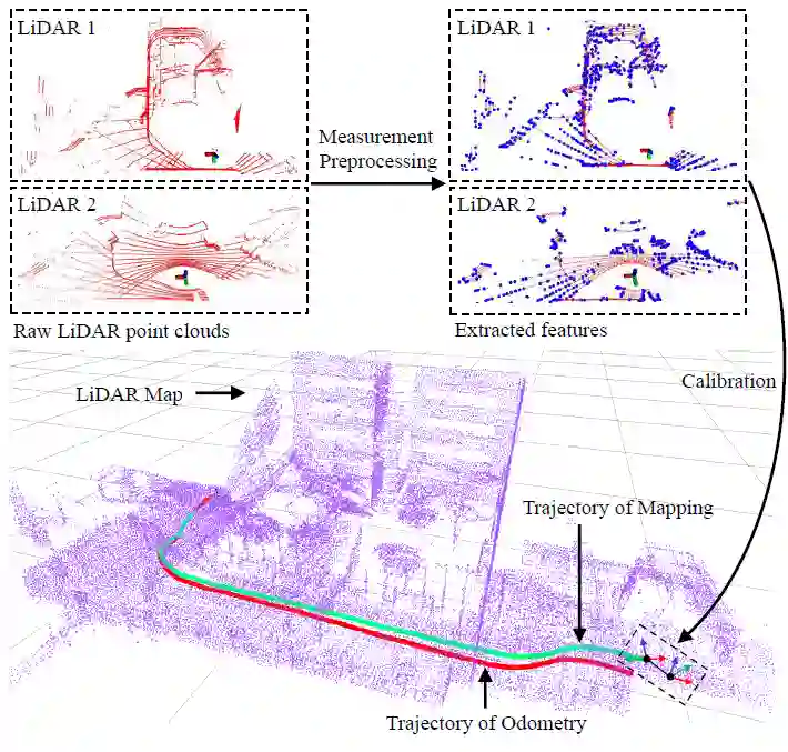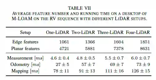 本文提出了一种系统来实现多激光雷达的同时外部校准、里程计和建图.我们的方法从测量预处理开始,从原始测量中提取边缘和平面特征.经过运动和外部初始化过程后,基于滑动窗口的多激光雷达里程计runs onboard,通过在线校准细化等来估计姿态.我们进一步开发了一种建图算法来构建全局地图,并优化具有足够特征的位姿,以及一种建模和减少数据不确定性的方法.我们通过对十个序列(总长度为4.60公里)的校准和SLAM的广泛实验来验证我们的方法的性能,并将它们与最新技术进行比较,我们证明了所提出的工作对于各种多激光雷达设置来说是一个完整、鲁棒和可扩展的系统.