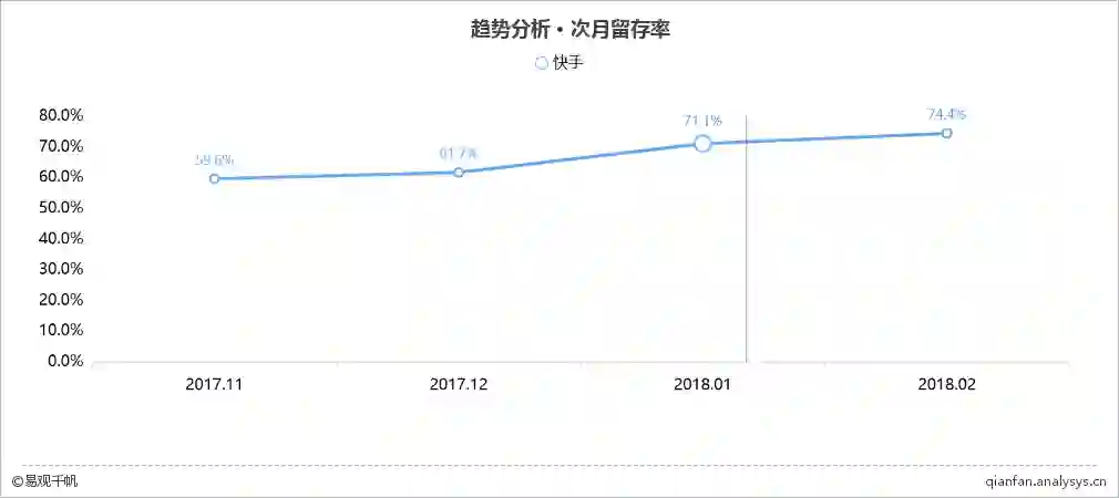 作为短视频综合平台领域的老大,快手拥有庞大的用户规模和较高的粉丝忠诚度。易观千帆数据显示,从去年9月份以来快手APP的活跃人数持续增长,在今年2月份环比增幅为8.2%,用户体量保持扩增。拉新的同时,快手“老铁”们的活跃度依然可观,次月留存率从去年11月一直走高,春节后甚至逼近75%。