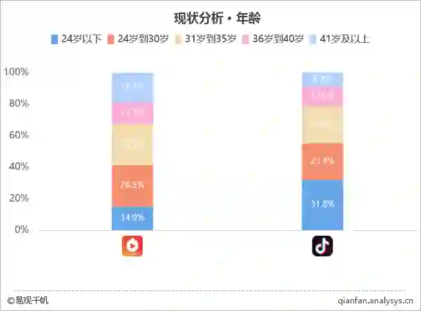 火山小视频和抖音APP同属头条系,与西瓜视频组合成同一短视频产品矩阵,但它们面向的细分市场并不重叠。易观千帆数据显示,火山小视频男性用户居多,用户整体年龄高于抖音APP。