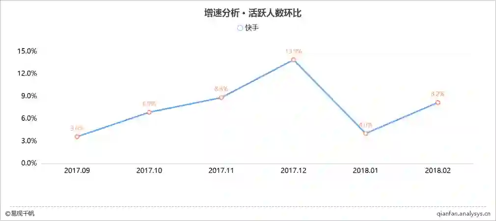 2017年9月-2018年2月快手APP活跃人数增速趋势