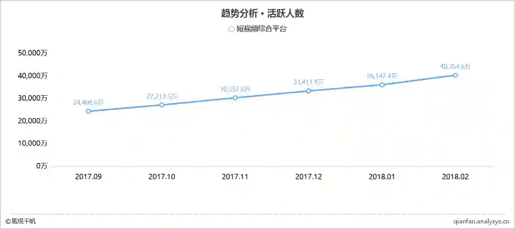 2017年9月-2018年2月短视频综合平台行业活跃用户趋势