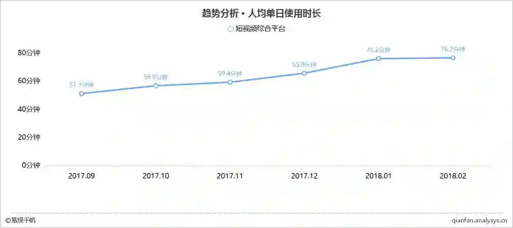 2017年9月-2018年2月短视频综合平台行业人均单日使用时长趋势