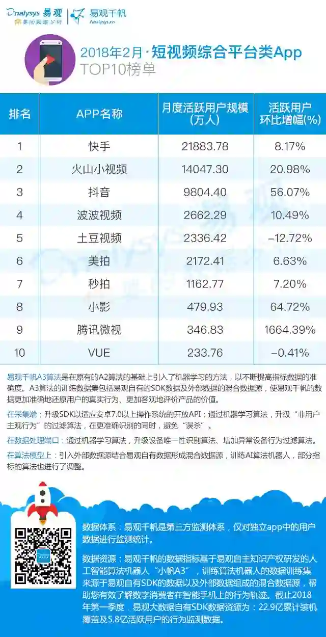 在易观千帆2月短视频综合平台APP榜单中,快手APP以21883.78万活跃用户的绝对优势稳居榜首,火山小视频和抖音APP分别位居第二、三位,行业头部玩家的优势依然显著。此外,腾讯微视卷土重来仅一个月,用户就已增长1664.39%;小影、波波视频等平台的活跃用户增幅较为明显。