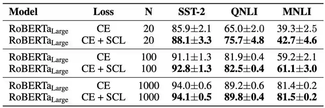 N表示训练样本数量。可以看到N=20时QNLI上有10个点之多的提升。