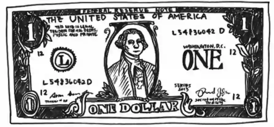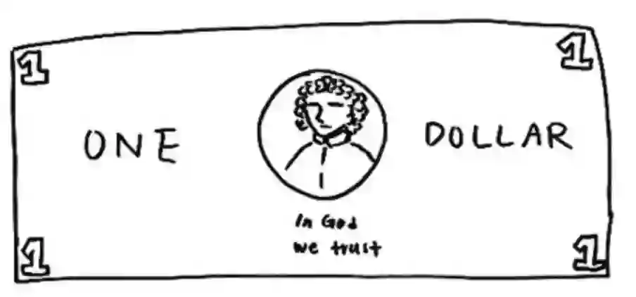 对比学习的核心思想,就是让模型学习如何将正样本和其他负样本区别开来,抓住样本的本质特征,而不是把每个细节都考虑到。拿人来举例,假如有人让你凭空画一张一美元,你可能只画成这样[2]: