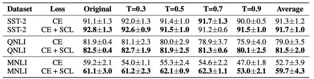 同时在有噪声的训练数据上SCL鲁棒性会更强(T越高噪声越多):