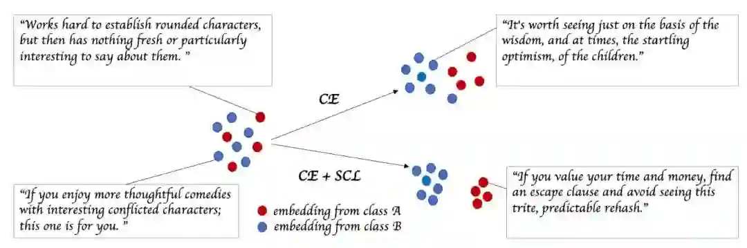 作者就针对分类任务进行了研究。分类的核心思想就是把不同类别的样本划分开来,通常使用交叉熵作为损失函数。作者则提出了一个新的对比学习loss SCL,将同一类的样本互相作为正例,不同类别的作为负例。以此达到拉近类内样本、拉开类间距离的目的: