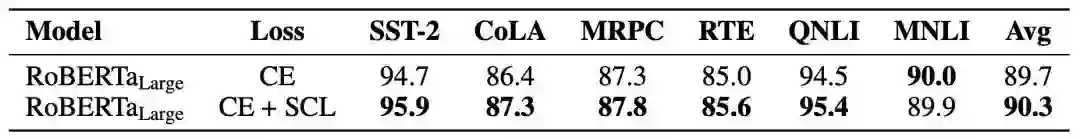 今天要介绍的这篇工作来自斯坦福和Facebook AI,作者在BERT分类任务的精调阶段加入了对比学习的loss,在各个任务上都获得了很稳定的提升: