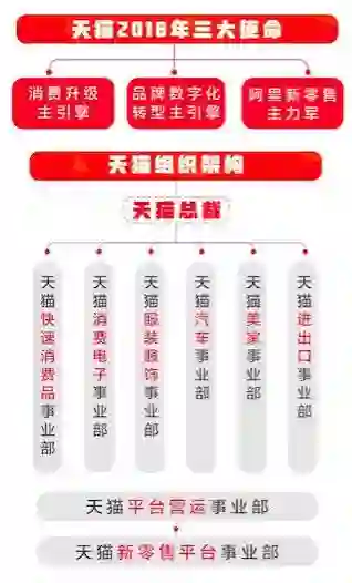 36氪讯,天猫总裁靖捷明确了2018年天猫三大使命:消费升级主引擎、品牌数字化转型主引擎、阿里新零售主力军。根据组织升级方案,新成立天猫消费电子事业部、天猫美家事业部、天猫平台营运事业部。此外,原电器美家事业组总经理印井将出任阿里巴巴集团CEO助理。