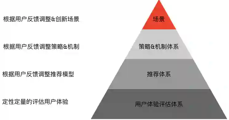 通过这些定性和定量的用户体验评估体系,我们采用知识图谱、统计学习、以及强化学习相结合的方式,构建出了如下的三层模型体系: