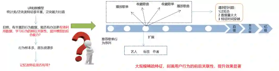 通过算法,我们需要将各种音乐指标抽象成标签。可是,虽然我们有足够多的音乐资源和行为样本,但是由于行为序列往往不是线性的,因此我们反而遇到了过拟合、以及特征时间穿梭(即特征记忆)方面的问题。