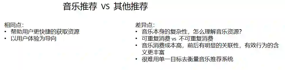 差异:各种音乐不但消费的成本较高,而且前后有着明显的关联性。另外,有效行为的含义往往会更加丰富。解决:利用复杂的 AI 模型,去探究用户听歌的序列关联性。