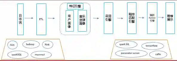 上图是我们整个音乐推荐系统的逻辑图,包括各种日志流、ETL、特征、召回、排序和最后的推荐。