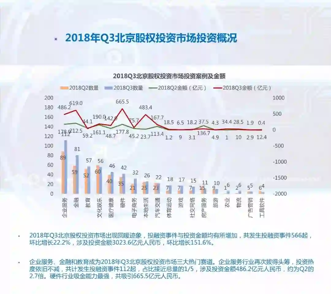 2018 年 Q3 北京股权投资市场出现回暖迹象,投融资事件与投资金额均有所增加。投融资事件 566 起,环比上升 22%,涉及投资金额 3023.6 亿元人民币,环比上升 151.6%。
