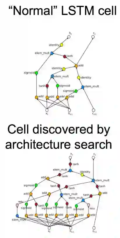 上图是正常的 LSTM 单元与架构搜索所发现的单元图。